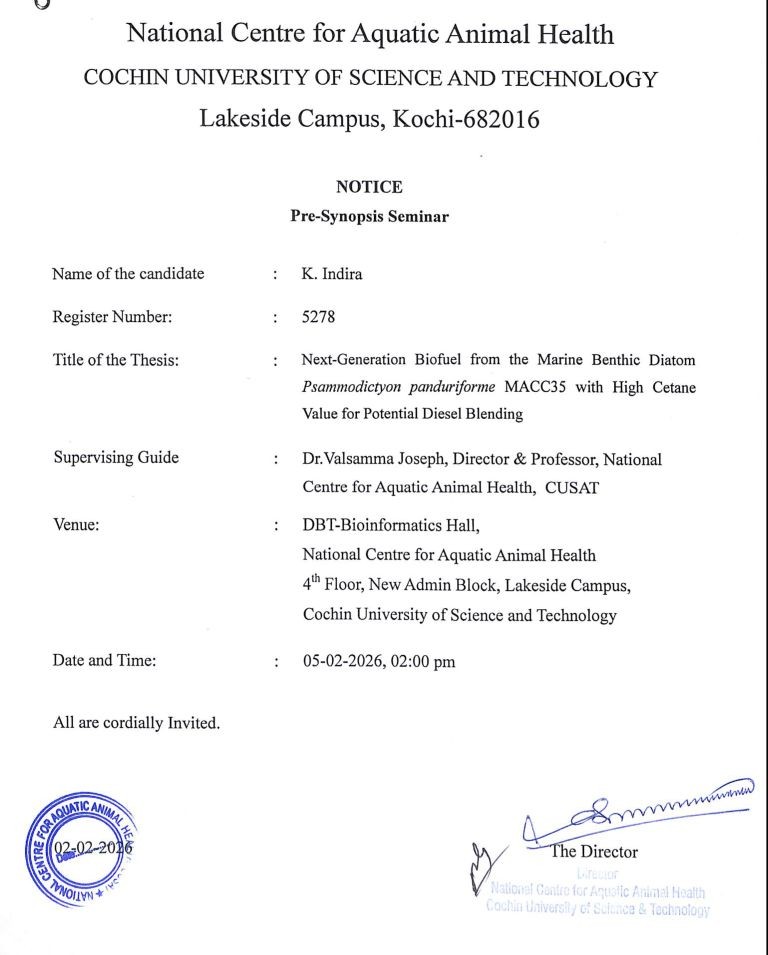 The Pre-Synopsis seminar in respect of Ms. K.Indira, Full time Research Scholar (Reg. No: 5287) under the guidance of Prof. Valsamma Joseph, Director & Professor, NCAAH, has been scheduled to be held at 02.00 pm on 05-02-2026 in the DBT-Bioinformatics Hall, NCAAH, 4th Floor, New Admin Block, CUSAT Lakeside Campus, Kochi-16.