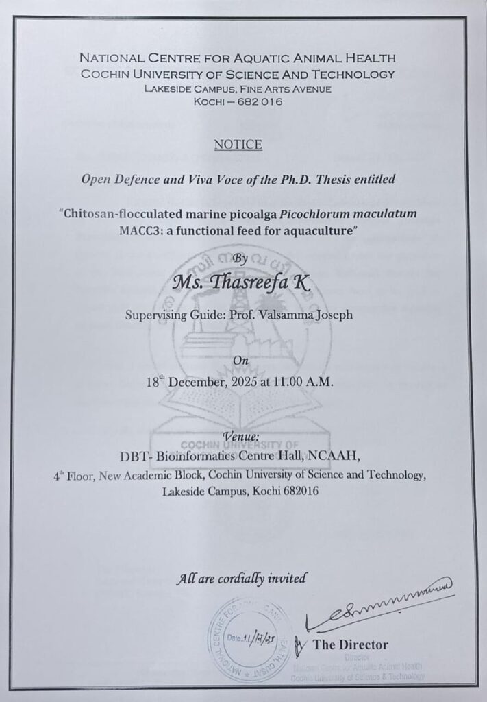 The Open Defense and Viva Voce in respect of Ms. Thasreefa K., Full time Research Scholar under the guidance of Prof. Valsamma Joseph, has been scheduled to be held at 11.00 am on 18-12-2025 in the DBT-BIC Hall, 4th Floor, New Academic Block, Cochin University of Science and Technology, CUSAT Lakeside Campus, Kochi-16.