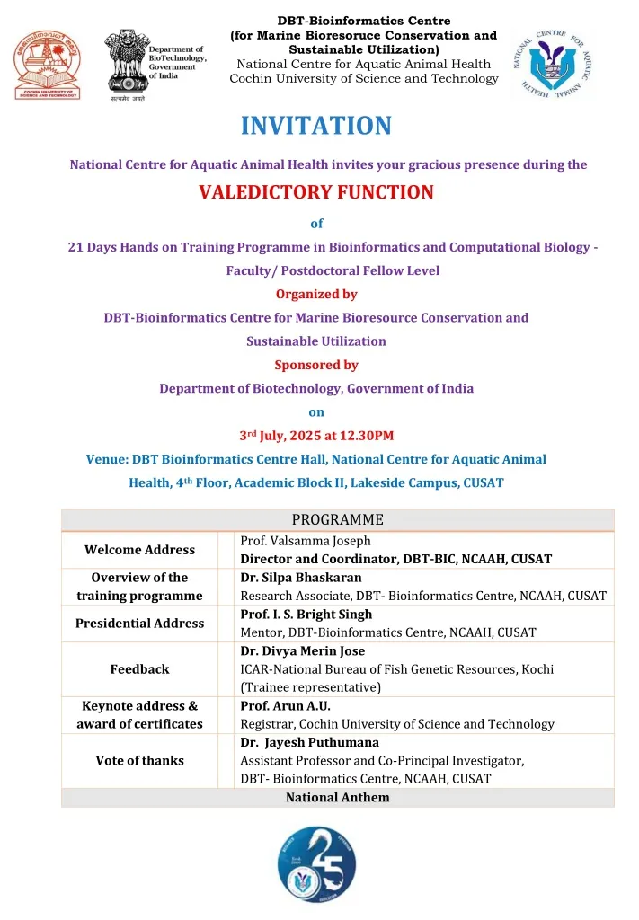 National Centre for Aquatic Animal Health invites your gracious presence during the Valedictory Function of DBT Sponsored by 21-day Hands on Training programme in Bioinformatics and Computational Biology for Faculty/ Post Doctoral Fellow level on 3rd July, 2025 at 12:30 pm, organized by DBT- Bioinformatics Centre for Marine Bioresource Conservation and Sustainable Utilization.