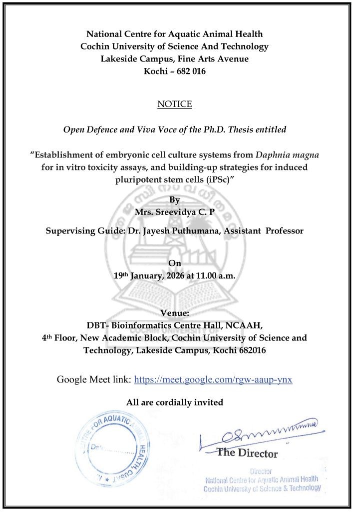 The Open Defense and Viva Voce in respect of Ms. Sreevidya C. P., Full time Research Scholar under the guidance of Dr. Jayesh Puthumana, has been scheduled to be held at 11.00 am on 19-01-2026 in the DBT-BIC Hall, 4th Floor, New Academic Block, Cochin University of Science and Technology, CUSAT Lakeside Campus, Kochi-16.